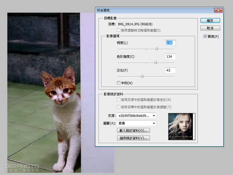 (上图)这时会跳出符合颜色的调整列,在影像统计资料的图层里,选择想撷取色调照片的档案名字。在完成选择后,照片就会套用悲惨世界剧照的整体色调,让你做预览。