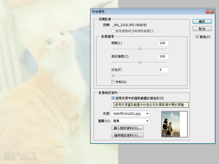(上图)在影像统计资料的来源中,选择海报档名时,记得勾选“使用来源中的选择范围计算色彩”。同样可以以预览的方式,再替照片做明度、色彩强度与淡化的效果。