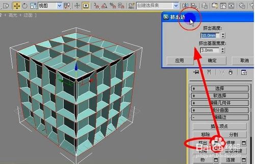4、在右下角的修改面板选择“挤出”,点击挤出的后面的修改选项,弹出对话框。