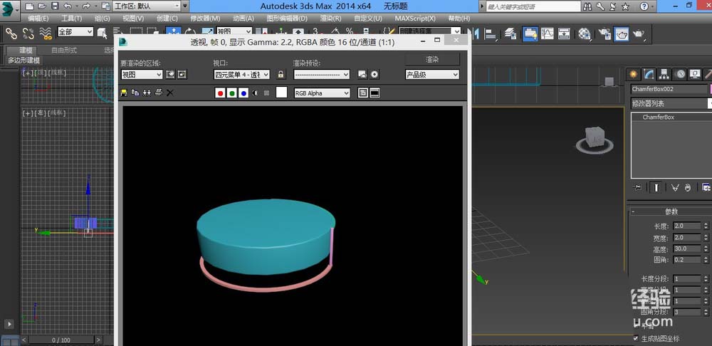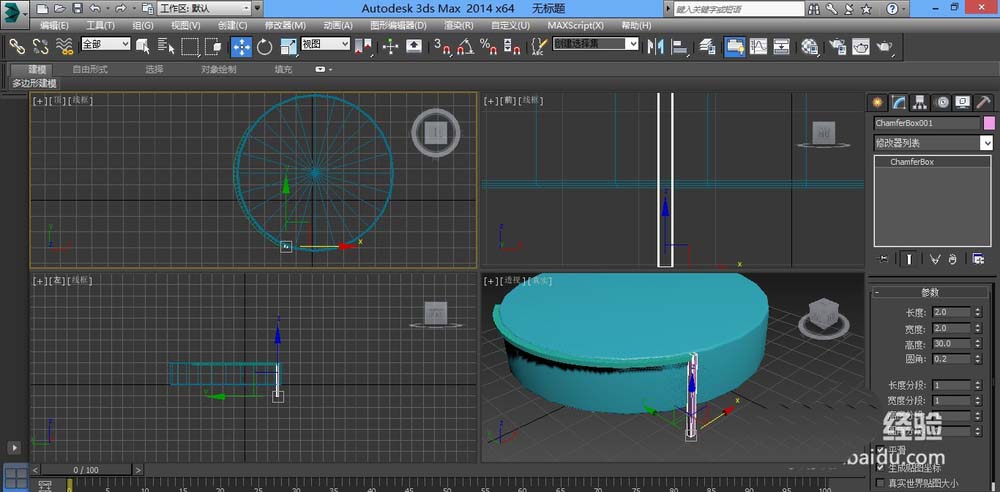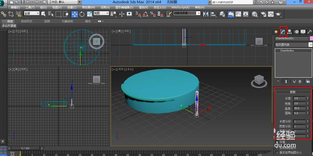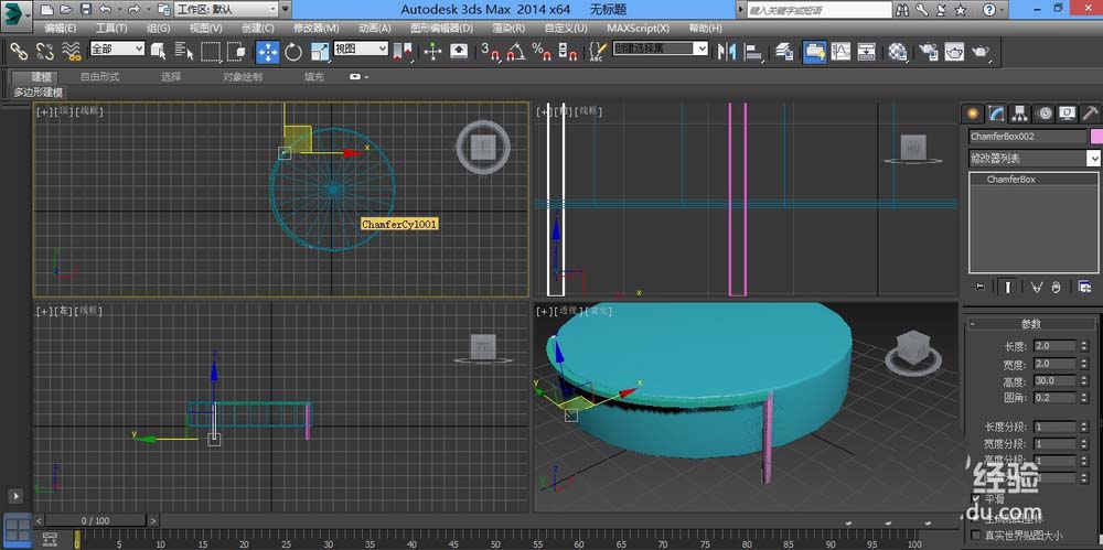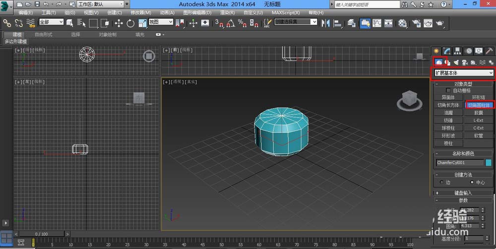 1、打开软件,几何体,扩展基本体,切角圆柱体,拉出一个圆柱体