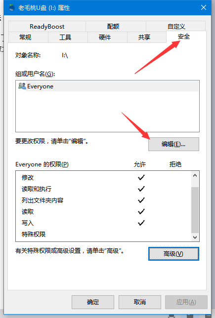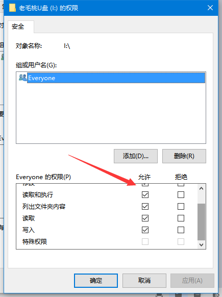 3、在权限设置界面勾选“写入”就可以了,其他权限按照需要设置,设置完毕后点击确定,之后就可以对U盘进行写入操作了。
