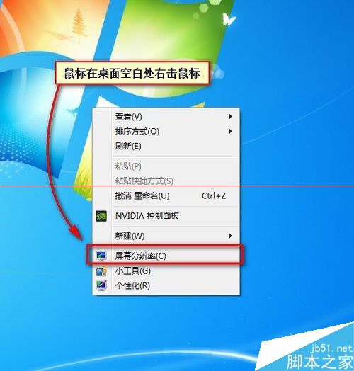 以win7系统为例,以前的xp系统是用鼠标在桌面空白处点击【右键】然后选择【属性】,在属性里【设置分辨率】的。而win7则有些不同,首先鼠标在桌面空白处【右键】,在右键菜单中直接显示了【屏幕分辨率】的选项,用鼠标点击一下这个选项。