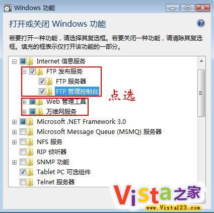 打开Vista操作系统的“控制面板”窗口,单击窗口中的“程序”选项,在开启的页面中点击“打开或关闭Windows功能”链接。在弹出的对话框中,展开“Internet信息服务”选项,勾选其下出现的“FTP发布服务”、“FTP服务器”、“FTP管理控制台”可选项。(图1)