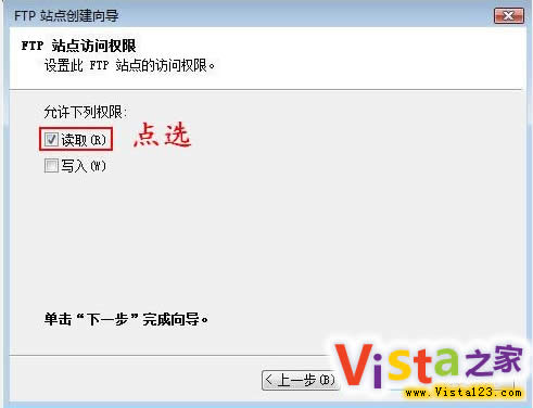 第三步:然后进入“FTP站点访问权限” 对话框,只勾选“读取”可选项项,普通用户将无法进行上传、删除、修改文件。而勾选“写入”可选项,则会令用户拥有全部的FTP站点权限。当上述设置完成后,单击“完成”按钮即可实现FTP服务器的创建。(图5)