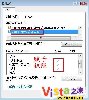 第二步:选择“组或用户名”列表中的“LW”,在下方的“LW的权限”列表中,分别勾选“读取和执行”、“列出文件夹目录”和“读取”可选项,单击“确定”按钮就完成了相应权限的指定。(图7)