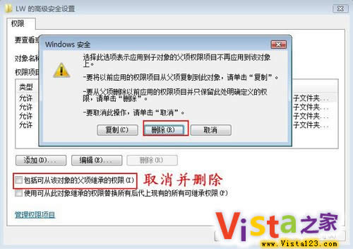 第三步:单击安全对话框中的“高级”按钮,在打开“高级安全设置”页面中点击“权限”选项卡,又点击其上的“编辑”按钮。在弹出的页面中,去除“包括可以从该对象的父项继续的权限”前面的钩,单击“确定”按钮完成权限设置。(图8)