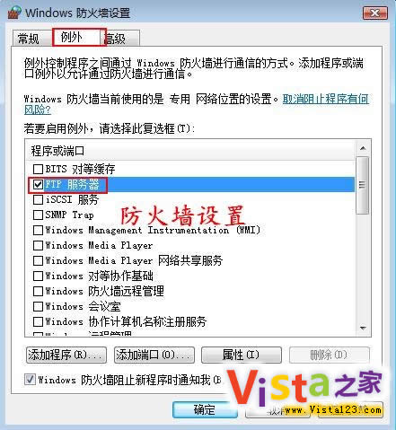当我们从XP登录Vista中的FTP服务器时,会出现无法打开FTP服务器的情况,这是什么原因呢?出现这种情况是因为还没有对Vista自带的防火墙进行设置。进入“控制面板”窗口,选择其中的“安全”组件,双击弹出页面中的“Windows防火墙设置”页面中单击“例外”选项卡,勾选项列表中的“FTP服务器”可选项即可。(图9)
