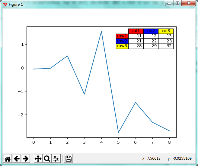 import matplotlib.pyplot as plt import numpy as np plt.figure() ax = plt.gca() y = np.random.randn(9) col_labels = ['col1','col2','col3'] row_labels = ['row1','row2','row3'] table_vals = [[11,12,13],[21,22,23],[28,29,30]] row_colors = ['red','gold','green'] my_table = plt.table(cellText=table_vals, colWidths=[0.1]*3, rowLabels=row_labels, colLabels=col_labels, rowColours=row_colors, colColours=row_colors, loc='best') plt.plot(y) plt.show()