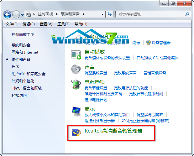 2.在“硬件和声音”界面中,选择“Realtek高清晰音频管理器”,如图2所示