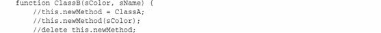 在这段代码中,为ClassA赋予了方法newMethod(记住,函数名只是指向它的指针)。然后调用该方法,传递给它的是ClassB构造函数的参数sColor。最后一行代码删除了对ClassA的引用,这样以后就不能再调用它。