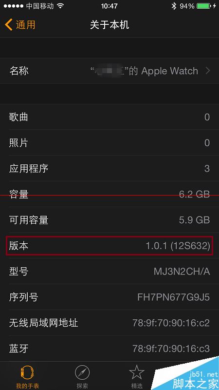 7、返回到“我的手表”-“通用”-“关于本机”,就可以查看更新后的Apple Watch的Watch OS版本了。截止本经验发布,Apple Watch OS的最新版本是1.0.1。