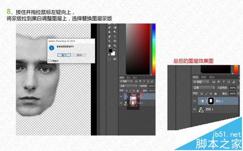 按住并拖拉鼠标左键向上,将蒙版拉到黑白调整图层上,选择替换图层蒙版