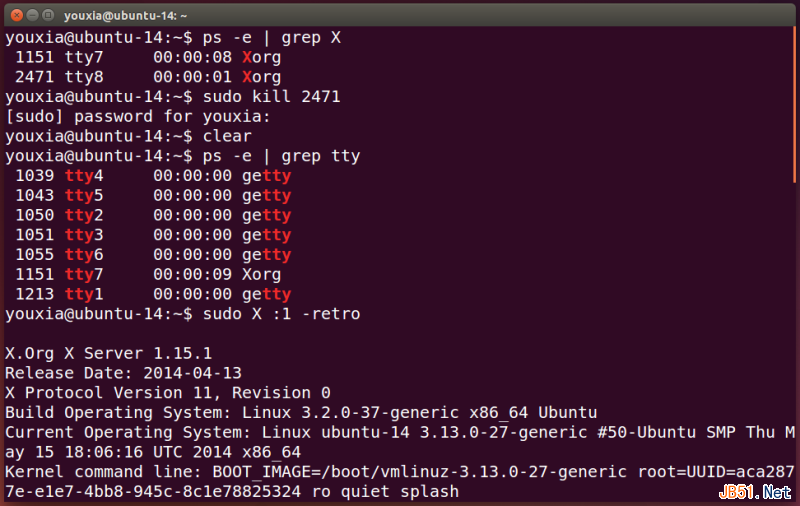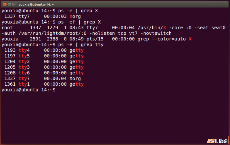 从上图可以看出,Ubuntu 14.04使用的X Window是Xorg。如果使用ps -ef命令,还可以看到Xorg运行时的命令行参数。