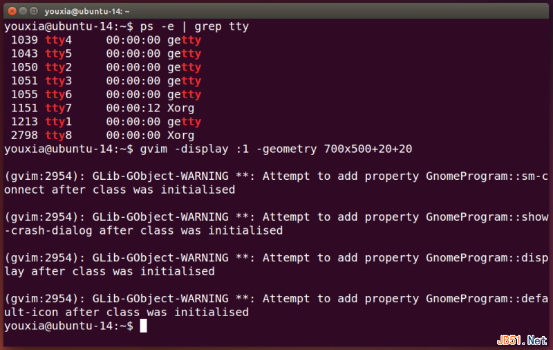 按Ctrl+Alt+F7回到display :0,再用ps命令看一下,会发现系统中有两个Xorg在运行,一个运行在虚拟控制台7,一个运行在虚拟控制台8。如下图: