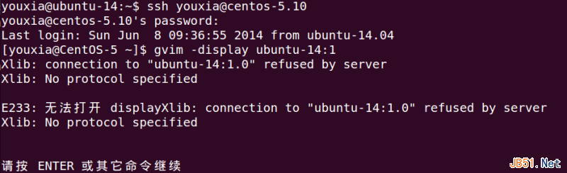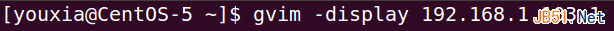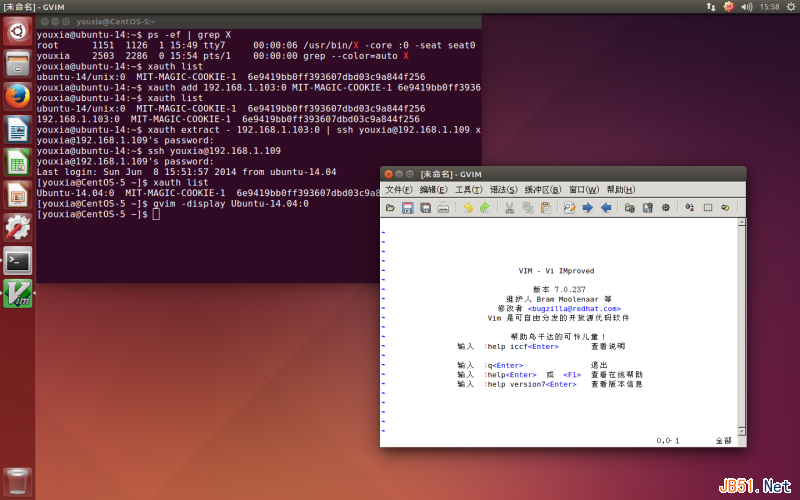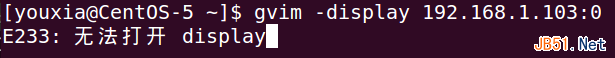 如果能让远程机器上的GVim也把窗口显示在本地机器的屏幕上,那就比较过瘾了。所以,使用ssh连接到CentOS-5.10,然后使用gvim -display ubuntu-14:1命令,希望将GVim显示到Ubuntu的display :1上。由于是远程连接,所以hostname不能省略,需写成ubuntu-14:1,也可以使用IP地址,写成192.168.1.103:1。如下图: