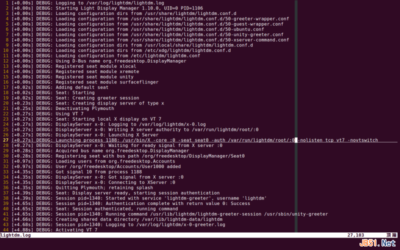 终于,从log文件中看到了lightdm启动的全过程。首先,看到它从哪几个目录加载配置文件,接着,看到它启动X Server。从下图光标所在的行可以看到X Server启动的所有参数,包括-nolisten tcp选项。