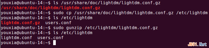同时,我发现/etc/lightdm/目录下没有lightdm.conf文件,而/usr/share/doc/lightdm/目录下有一个lightdm.conf.gz文件,把该文件当文档看了一下,发现里面果然就是lightdm的配置的解释。赶快将该文件复制到/etc/lightdm/目录下并解压,如下图: