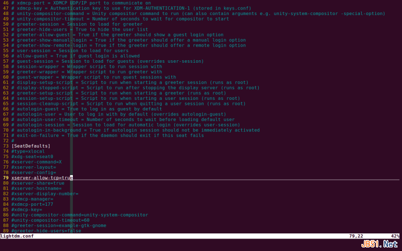 然后用Vim编辑/etc/lightdm/lightdm.conf文件,将xserver-allow-tcp=false一行前面的注释去掉,并且改为xserver-allow-tcp=true。如下图: