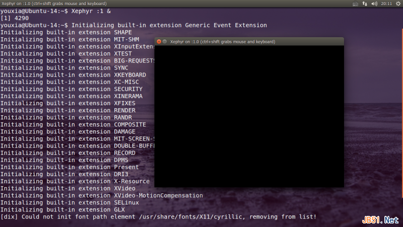 现有的图形界面中可以运行嵌套的X Server我们上面运行的X Server都是直接占用了计算机的整个显示器和键盘鼠标,事实上,在现有的图形界面中,还可以以窗口模式运行另外一个X Server,称为nested X Server。最常用的nested X Server是Xephyr,在Ubuntu中可以通过如下命令安装它: