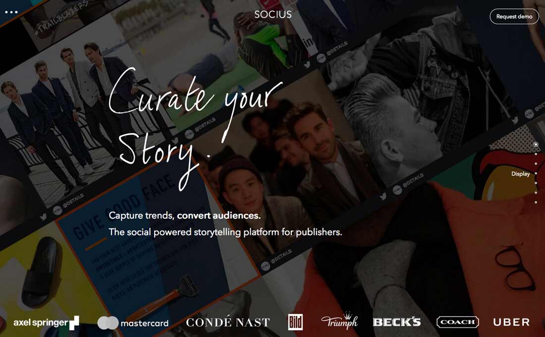 在上面的Socius 页面的右侧,使用了许多同类网站都采用的小圆点来作为视觉标识,当光标悬停在小圆点上的时候,会有信息浮现,告诉用户这些区域的内容。同样的,用户可以通过点击这些小圆点快速跳转到特定的区域。