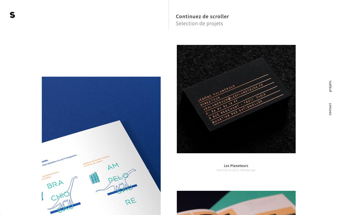 和侧边栏导航不同,这种完全旋转90度到右侧的文字导航,设计的更加微妙,通常出现在小型的作品展示型的网页上。就像上方这个名为S的网站。