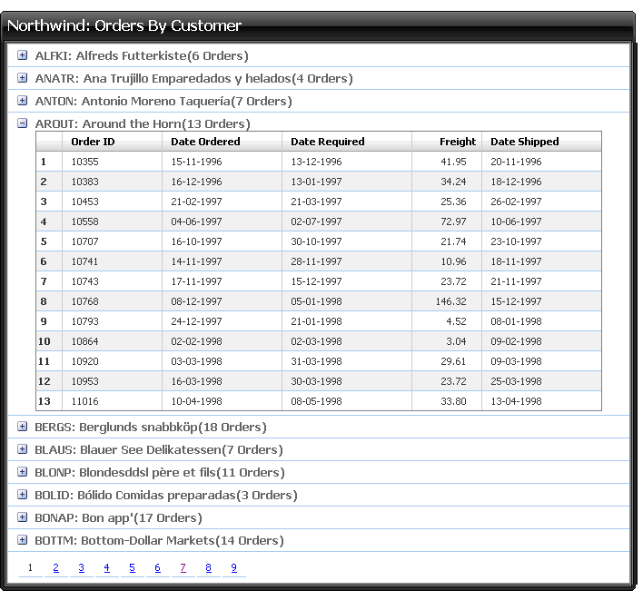 使用northwind的数据。点击前面的加号会把其它属于这个产品的详细订单展示出来,而每个产品后面都会有它的订单个数。点击'+'后的样子: