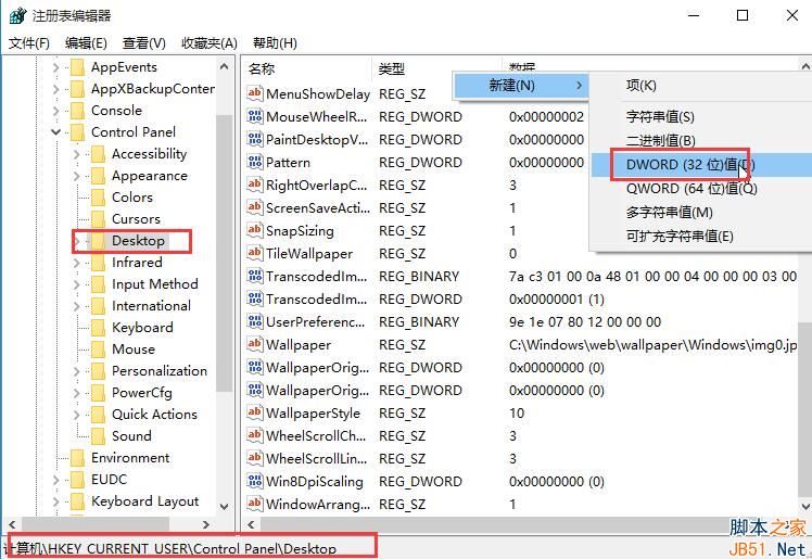 2、在注册表中依照路径找到HKEY_CURRENT_USER\Control Panel\Desktop,在右侧新建一个DWORD(32位)值,命名为JPEGImportQuality;