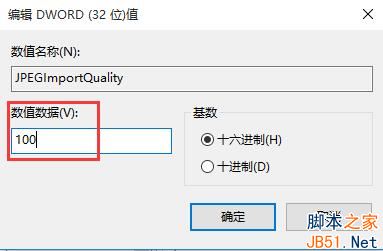 3、双击打开JPEGImportQuality设置界面,将其数值设置为100,点击确定然后重启电脑就可以了。