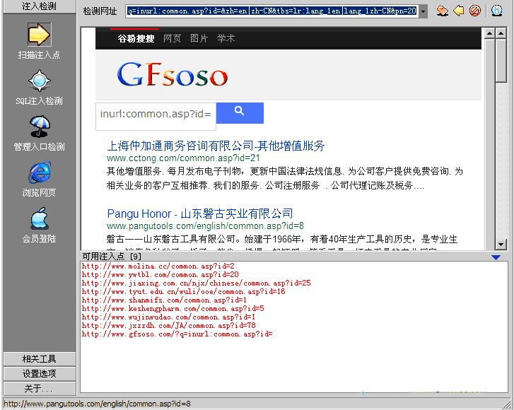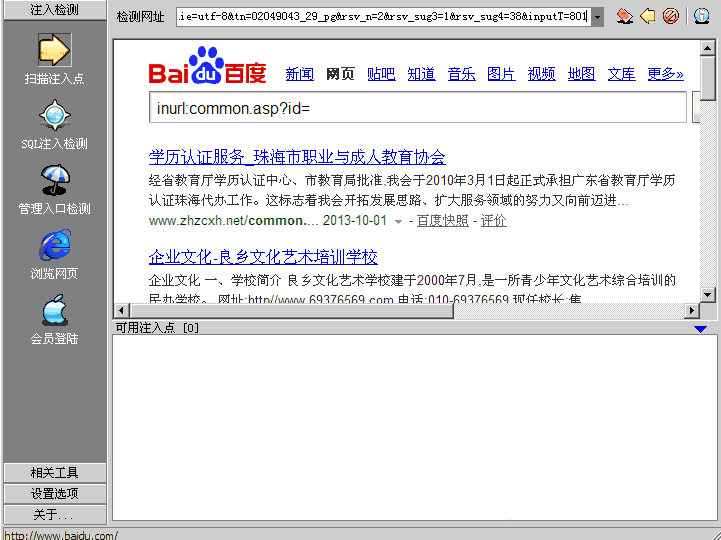 我们要搜索所有网站后缀存在common.asp?id=页面的时候就可以通过inurl:common.asp?id=进行批量检测那些存在有注入SQL漏洞。