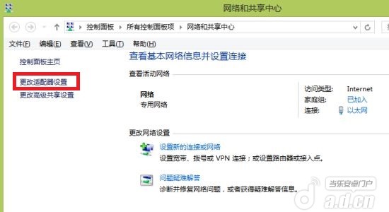 运行成功后,打开网络和共享中心,点击左侧更改适配器设置。
