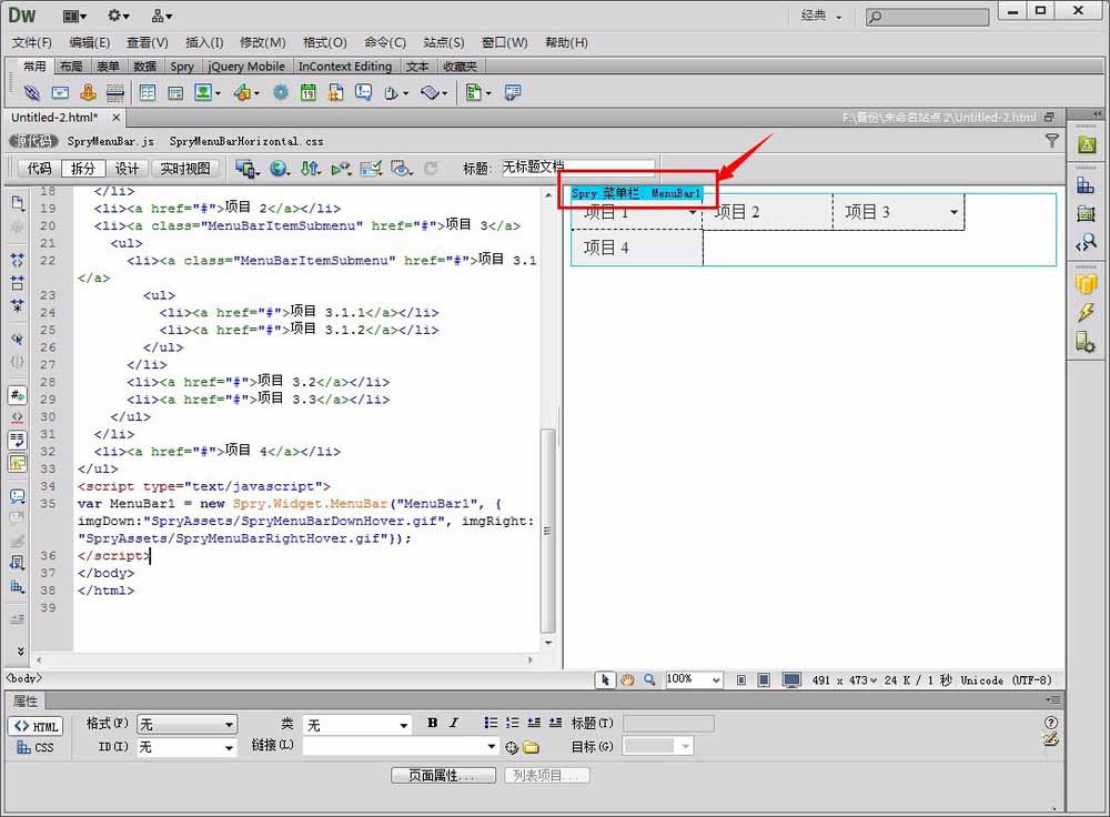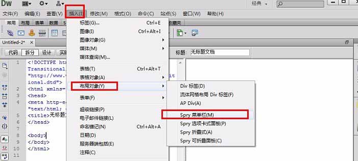4、在Dreamweaver cs6中已经没有插入导航条对象了,这里用spry菜单栏,操作更方便。在菜单中找到“插入"—"布局对象"—”spry菜单栏“如下图所示。