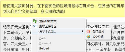 目前只有火狐浏览器是唯一实现了这个API的浏览器。一些特别重要的功能我一般不喜欢放到右键菜单里,但有这样的功能当然是十分方便,这个API的主旨是提高易用性而不会有任何负面影响。我在菜单里放置的分享功能就是一个很好的例子。相信你在你的项目里也经常使用右键菜单,不是吗?
