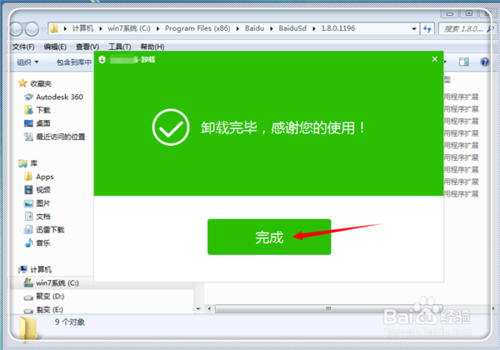 8、如果软件较小,卸载就较快,大的可能多一些时间,卸载完毕,点击“完成”进行确认。这样就 将想卸载但不能卸载的软件成功卸载了。