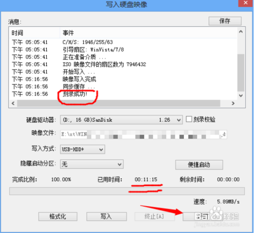3、单击【启动】--“写入硬盘映像--可以看到U盘、映像文件都被自动识别,那就直接单击“写入”吧!图2是写入过程,大约经历11分钟。最后,返回即可。