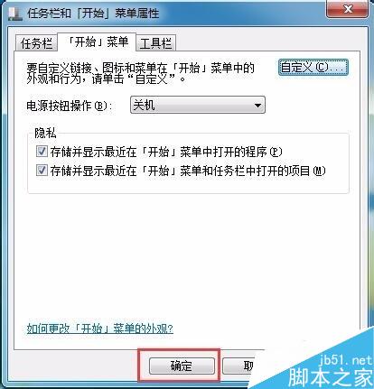 3、鼠标点击“属性”菜单项,系统会弹出一个对话框,选择“开始菜单”选项卡如图所示: