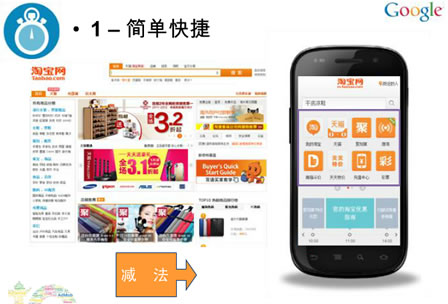 减法,减法,减法(解释一下,这一点其实就是在强调手机网站要去掉一切可以去掉的内容、功能、板块、按钮等,只留下最精华的部分,记住是最精华的部分。谷歌举例了淘宝的移动网站)