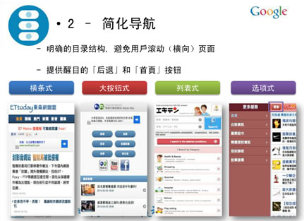 对于导航的目录结构,谷歌列出了四种常见的手机网站的导航形式,分别是: