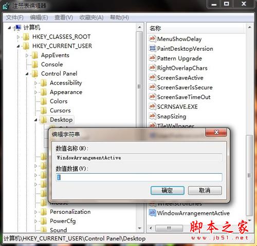 运行“regedit”打开注册表,定位到HKEY_CURRENT_USER“Control Panel“Desktop,在右侧窗口中找到并双击“WindowArrangementActive”然后在弹出的对话框中,将系统默认的值“1”修改为“0”。