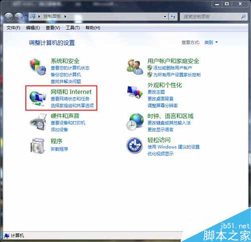 在“控制面板”里选择“网络与Internet”,点击“查看网络状态与任务”。