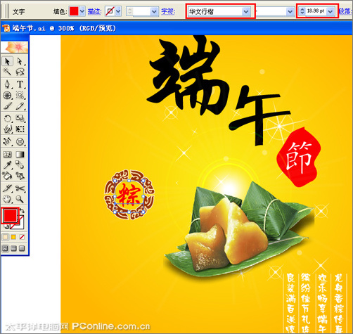 14、在工具箱选择文字工具,设置为直排文字,在属性栏设置文字为华文行楷,字体大小为18.98pt,颜色为红色,在工作区输入“粽”,然后调整大小, 如图17所示。