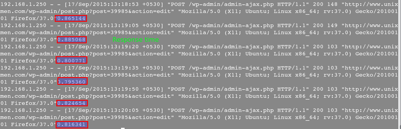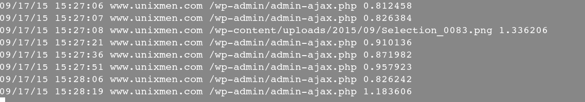 $ justniffer -i eth1 -l "%request.timestamp %request.header.host %request.url %response.time"