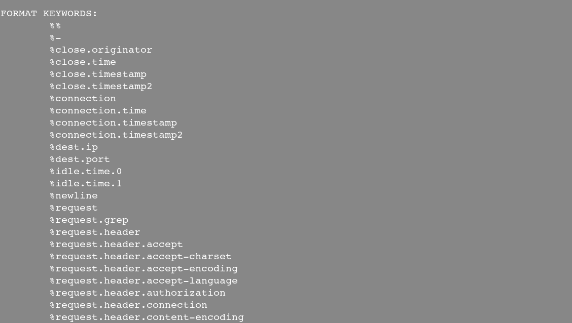 当你输入 justniffer -h 的时候你可以看到很多用于以更精确的方式获取数据的格式关键字。