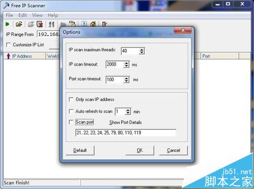 8、在Options中,我们可以修改扫描时间和自动扫描时间间隔。还可以让 Free IP Scanner 扫描预设的端口。