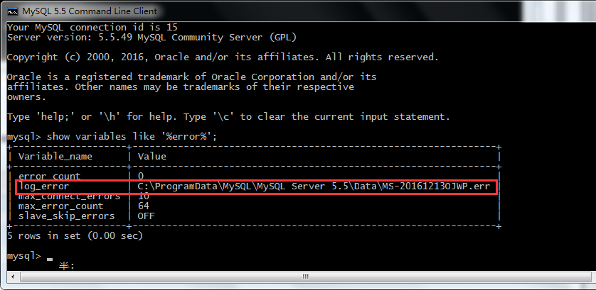 不知道windowns日志文件位置的可以用命令->show variables like '%error%';查看