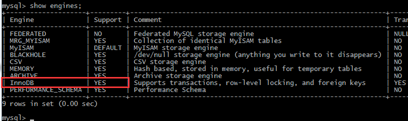 我用的是MySql5.5版本的数据库。出现以上错误的时候先用命令-》show engines;查看一下引擎详情: