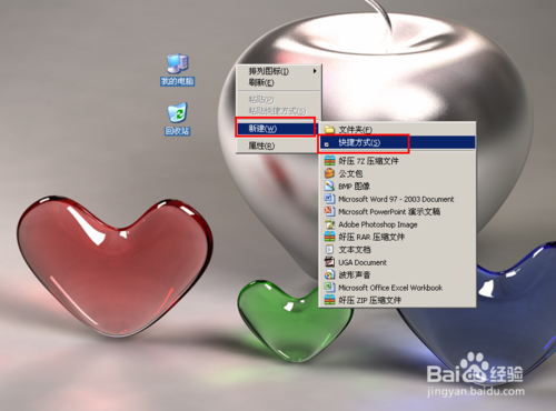 先关闭或者打开所有的窗口,然后在桌面上点击鼠标右键,之后在弹出的右键菜单中依次选择:“新建”----->“快捷方式”