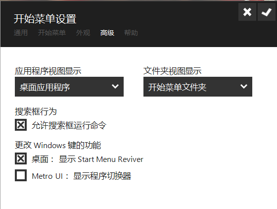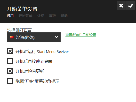 开始菜单的详细设置功能如下,共分:通用、开始菜单、外观、高级等。