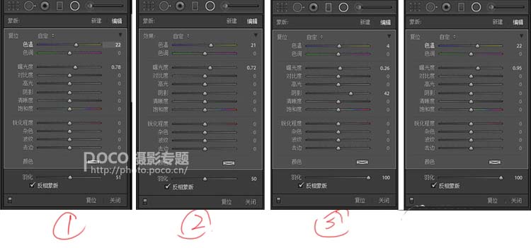 ③的范围稍微要比①和②大一些,稍微加一点色温、曝光和阴影,是为了增加灯笼的暖光打在脸上和上面树的效果。但是羽化一定要开到最大,更自然,更真实一些。
