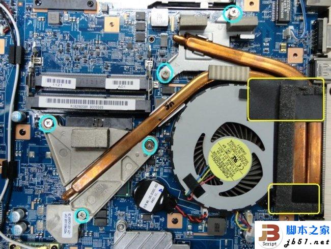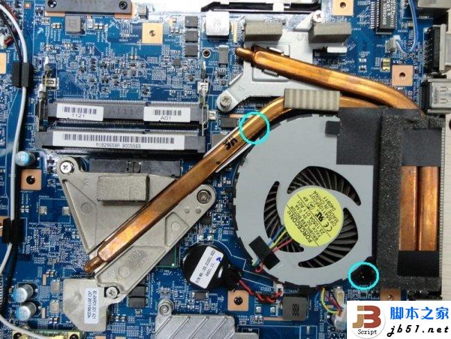上图两个蓝色的圈圈,右下角的是一个很明显的风扇固定螺丝,而左上角的那个却被散热铜管遮盖,由于先前已经拆掉了散热铜管的固定螺丝,我是用了拐弯螺丝刀+微微抬起散热铜管的方法拆掉了左上角的风扇固定螺丝。一定要对散热铜管温柔哦。哈哈。螺丝都拆掉了,此片教程也接近尾声了,谢谢大家观看。希望对大家有所帮助。