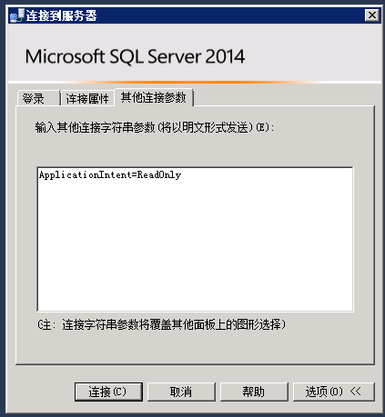辅助数据库仅接受ApplicationIntent=ReadOnly的连接,其它的连接方式无法连接。